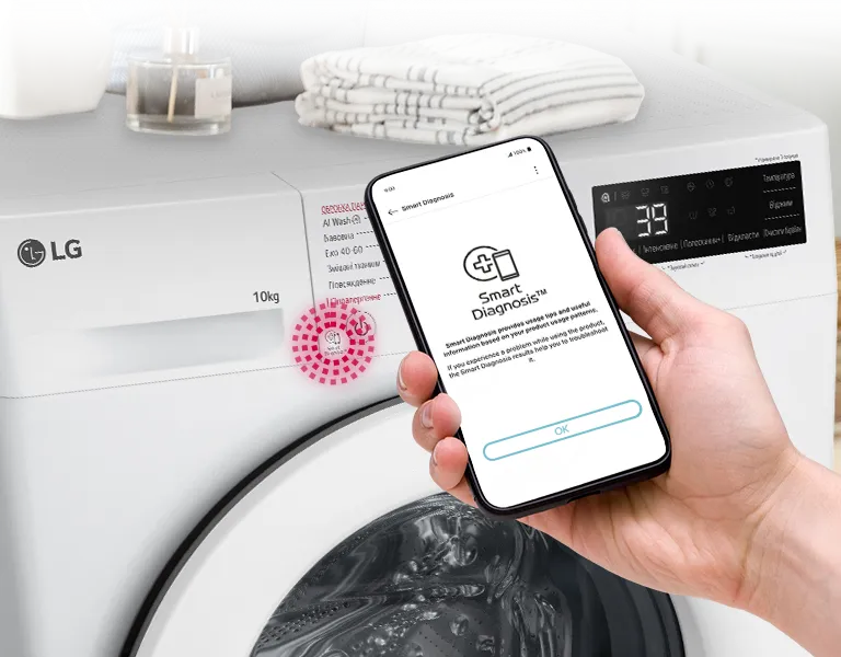 Функція мобільної діагностики Smart Diagnosis™ знаходить збої в роботі та виявляє внутрішні несправності машини. Отримана інформація швидко передається до сервісного центру. Щоб активувати Smart Diagnosis™, потрібно лише встановити програму LG ThinQ™** на Ваш смартфон.