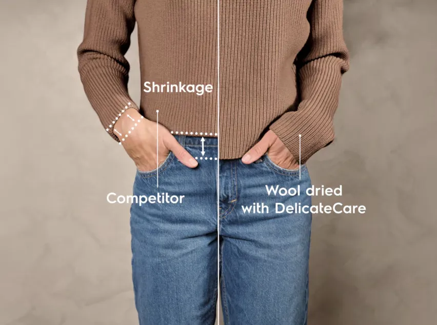 DelicateCare використовує тепловий насос для сушіння делікатного приладдя, адаптуючи відповідним чином температуру і рух барабана і продовжуючи термін служби одягу. Навіть тканини на кшталт шовку та вовни сушаться з надзвичайною дбайливістю. Сертифікований Woolmark.