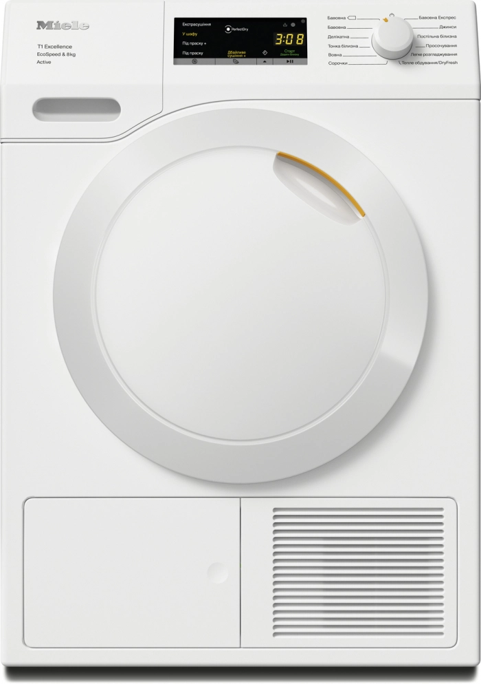 Модель має завантаження 8 кг і підтримує широкий вибір програм, зокрема: Бавовна, Бавовна Eco, Бавовна Експрес, Делікатна, Тонка білизна, Вовна, Постільна білизна, Сорочки, Джинси, Просочення, Теплий обдув/DryFresh, Легке розгладжування. Для додаткової зручності передбачена функція Add laundry, що дозволяє додавати речі в процесі сушіння. Система Perfect Dry автоматично налаштовує тривалість програми відповідно до залишкової вологості білизни, забезпечуючи ідеальний результат. EcoSpeed скорочує час сушіння без шкоди для якості, а FragranceDos дарує білизні приємний, свіжий аромат. Для комфорту користувача передбачено індикацію очищення фільтрів та ємності для збирання конденсату, блокування ПІН-кодом, відстрочку старту до 24 годин, а також інтелектуальний реверс барабана, що запобігає зминанню речей. Обслуговування спрощене завдяки теплообміннику, який не потребує догляду.
