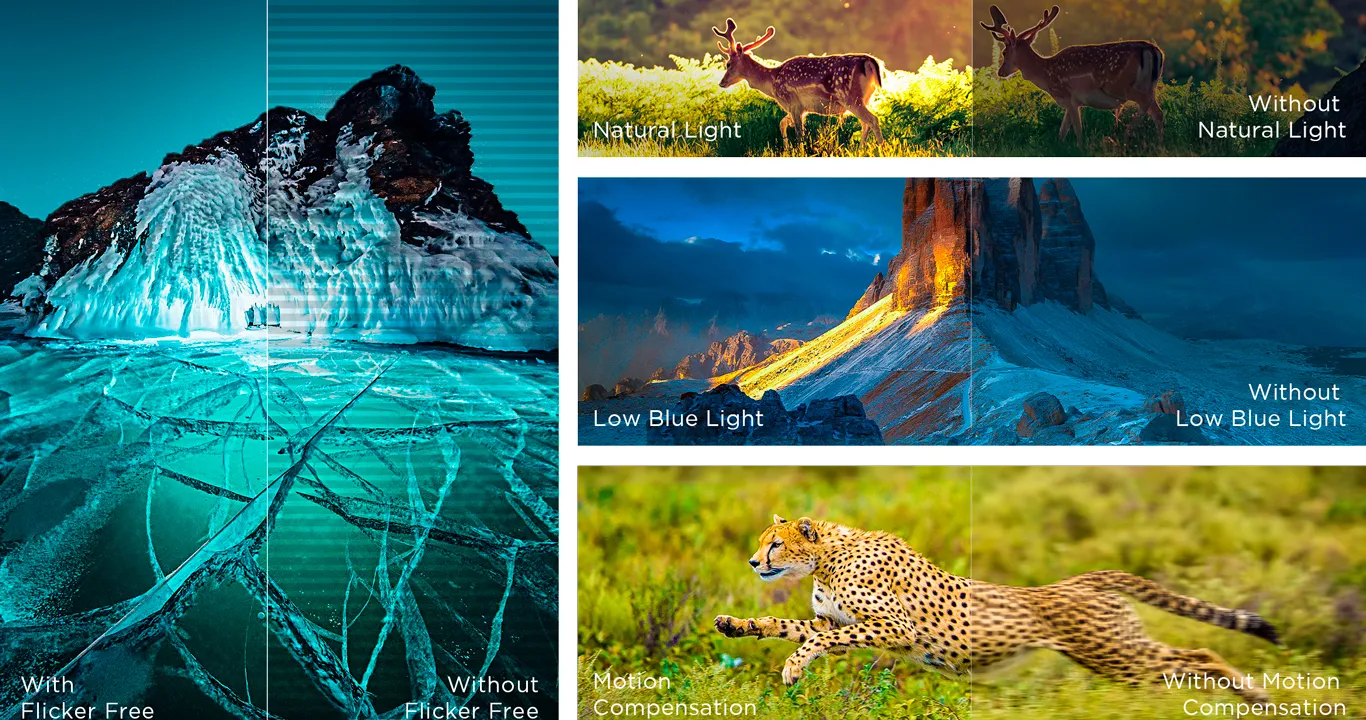 Завдяки комплексу технологій для захисту очей, таких як знижене синє світло, оптимізація природного освітлення, відсутність мерехтіння тощо, серія P7K продовжує піклуватися про ваше здоров’я очей. Все, що вам потрібно — це насолоджуватися фільмами та іграми.