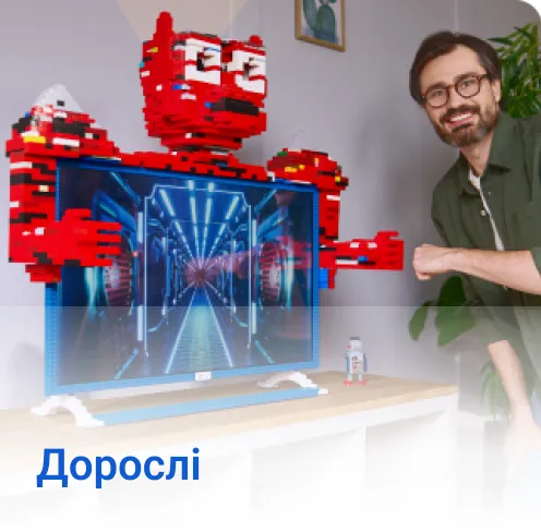 Монітор всередині футуристичного піратського корабля чи інтерактивний екран сцени улюбленої групи? Чи може Зала Слави Кращих Експонатів Колекції? Вирішувати тільки Вашій дитині. Особлива рамка KIVI KidsTV сумісна з усіма популярними Brick-конструкторами та дозволяє втілювати в життя найсміливіші фантазії дитини, що робить її телевізор справді персональним.