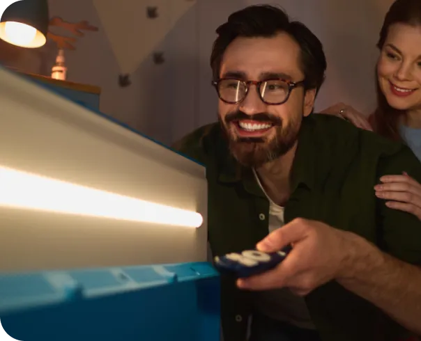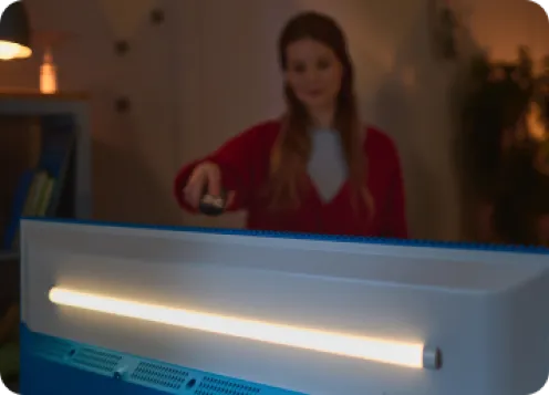 забезпечує мʼяке інтерʼєрне освітлення Ambient Light. У поєднанні з технологією Low Blue Light зменшує навантаження на дитячі очі під час перегляду телевізора в темній кімнаті. Нічник керується пультом телевізора, не потребує окремих блоків живлення чи підключень.