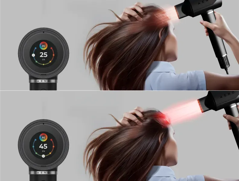 Фен постійно аналізує відстань до волосся та динамічно коригує температуру повітряного потоку відповідно до заданої вами цільової температури. Оскільки при зміні відстані однакова температура повітря впливає на волосся по-різному, інтелектуальний контроль запобігає перегріву, забезпечуючи швидке та безпечне сушіння. Це мінімізує ризик пошкодження волосся й створює оптимальні умови для укладки