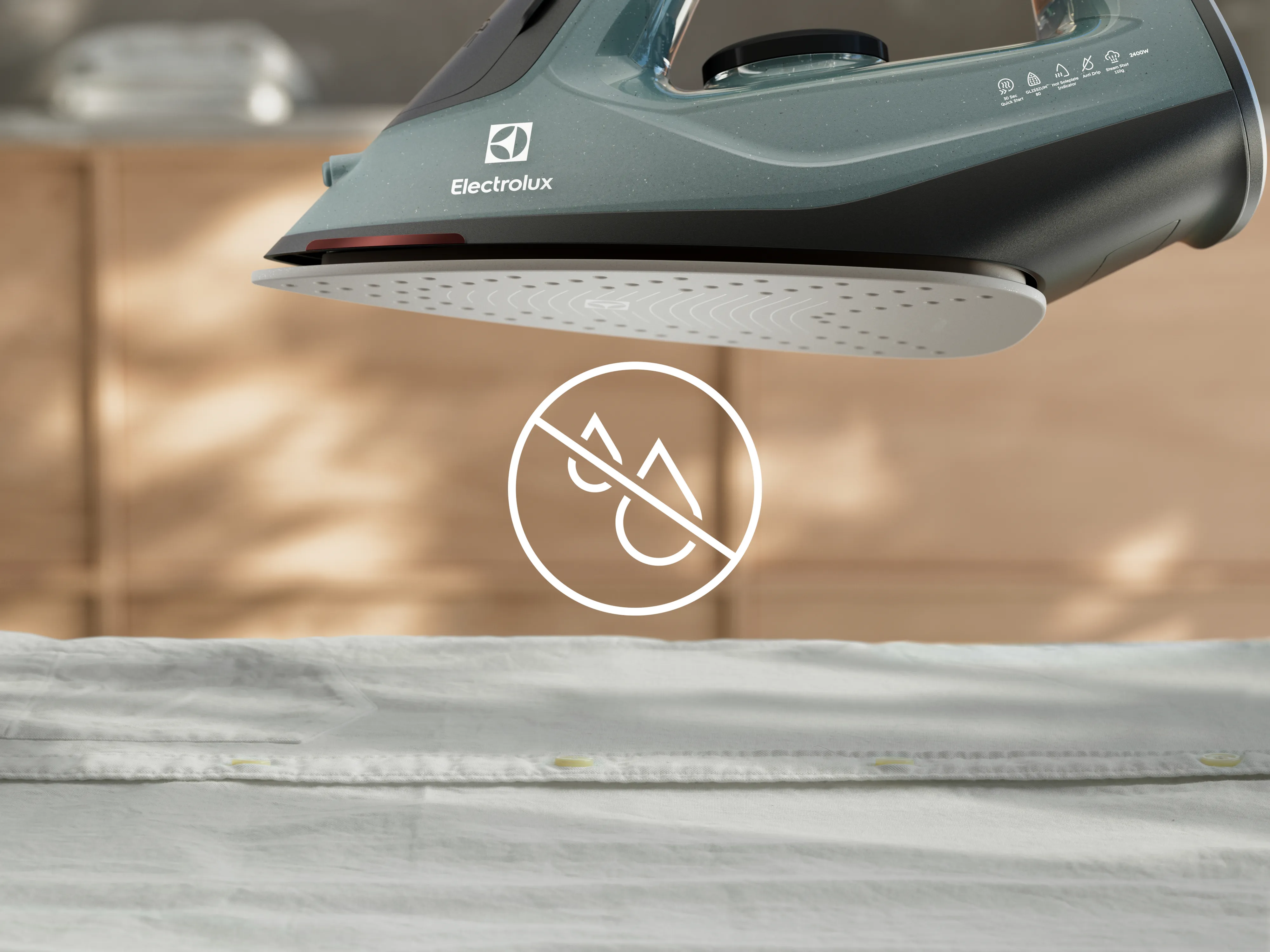 Мінімізуйте ризик появи слідів від води на одязі. Протикрапельна подвійна металева конструкція праски запобігає потраплянню води в парову камеру, коли температура занадто низька.