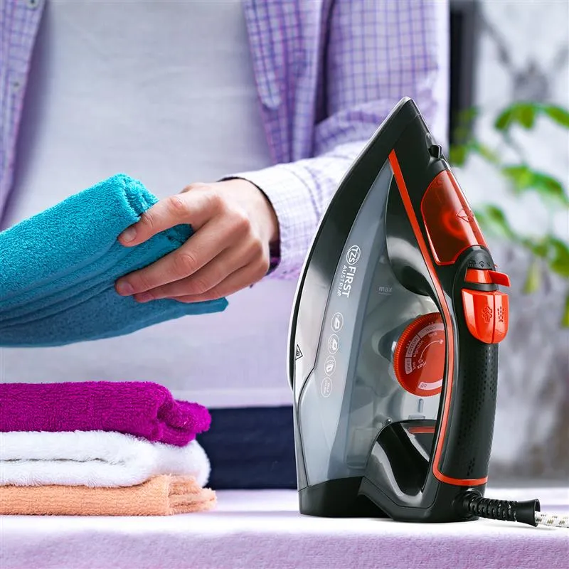 Парова праска First Austria потужністю 2200 Вт забезпечує комфортне та легке розгладження будь-яких типів тканин. Керамічна підошва легко ковзає по поверхні, не залишаючи заломів, а інтенсивна подача пари — до 30 г/хв — дозволяє ефективно справлятися як з тонкими, так і з щільними матеріалами. Для складних ділянок передбачені функції розпилення води і сухого прасування. 49 отворів рівномірно розподіляють пару по всій підошві, прискорюючи процес обробки великих обсягів тканини.