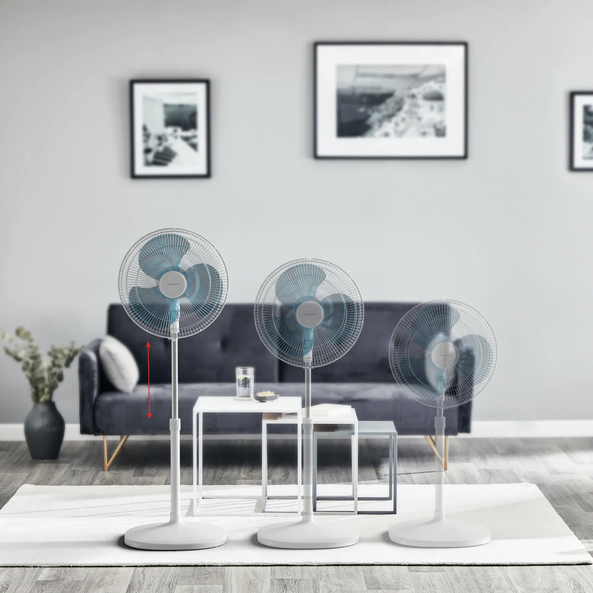 Цей компактний підлоговий вентилятор може також похвалитися практичною конструкцією, яка дозволяє гнучко налаштовувати його відповідно до ваших побажань. Він має регульовану висоту від 90 см до 130 см, що допомагає легко адаптувати його до будь-якого простору. Тому хочете ви використовувати його у вітальні або поставити поряд з ліжком — він скрізь буде доречним і зможе забезпечити вам оптимальне охолодження. Крім того, його легко переміщати та зберігати, коли він вам не потрібен.