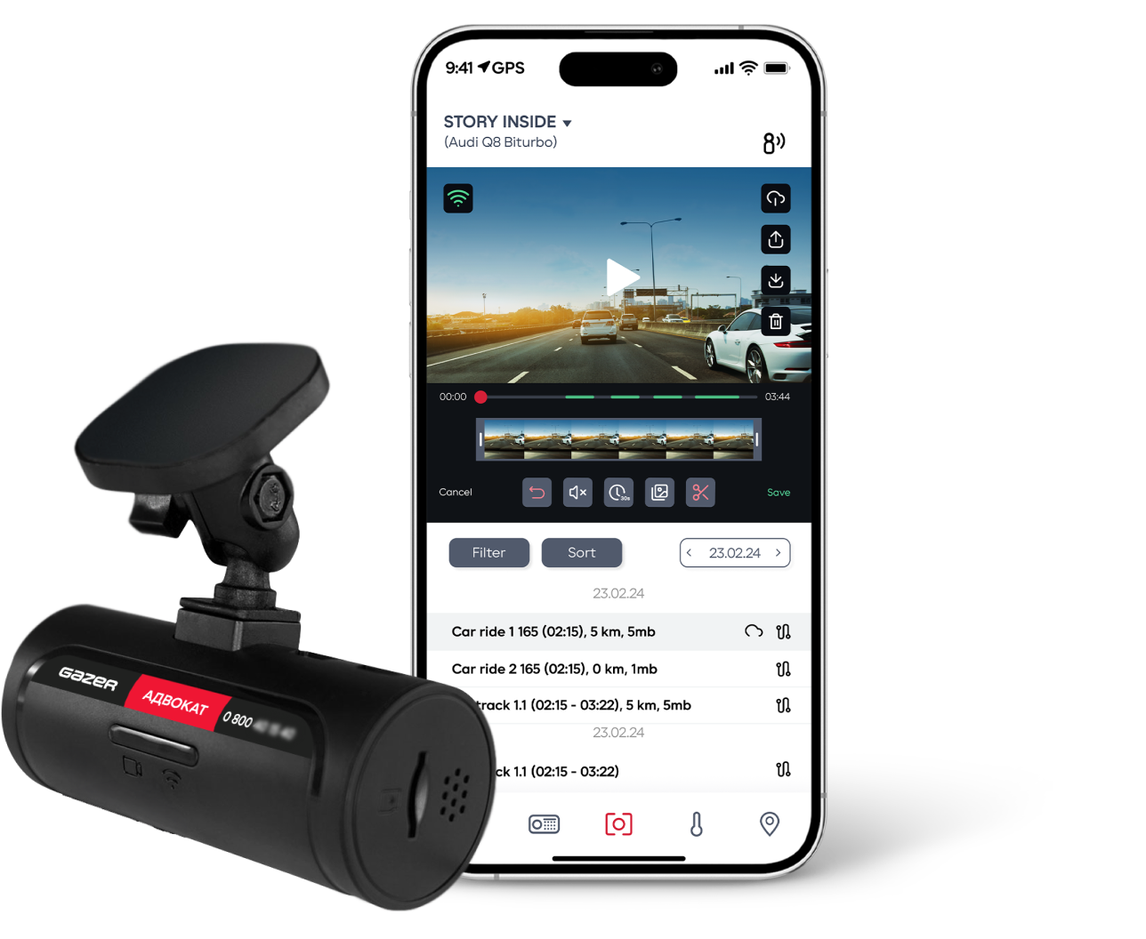 Налаштовуйте відеореєстратор та переглядайте записані відео так само легко, як дивитеся ролики в Інтернеті. Gazer E7 Ultra оснащений Wi-Fi модулем, доступним через безкоштовний додаток Gazer Car для Android та iOS. З його допомогою ви можете переглядати, редагувати та зберігати відео на смартфон, а також налаштовувати всі параметри пристрою.