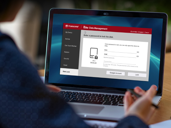Пристрої зберігання Transcend мають ексклюзивні функції безпеки та блокування накопичувача. За допомогою програмного забезпечення Transcend Elite можна захистити свої дані відповідним високим стандартам інформаційної безпеки.