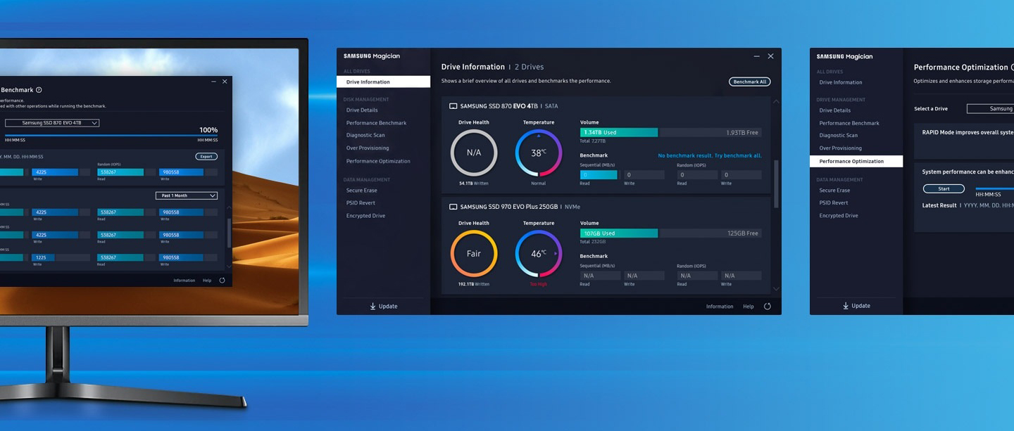 Нехай ваш диск працює як магія. Нове та вдосконалене програмне забезпечення Samsung Magician 6 буде постійно контролювати ваш твердотільний диск. Ви можете легко керувати своїм диском за допомогою широкого набору корисних інструментів, щоб бути в курсі останніх оновлень, контролювати стан диска або навіть підвищувати його продуктивність.
