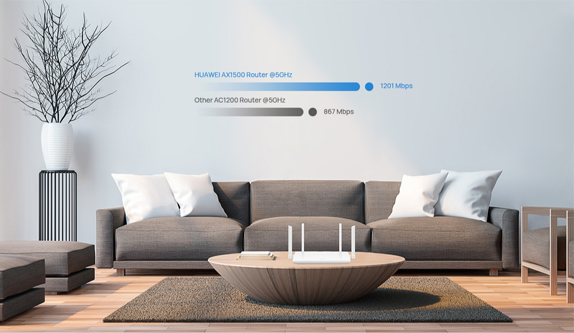 HUAWEI WiFi AX2 може одночасно працювати в обох діапазонах 5 та 2,4 ГГц та автоматично перемикати пристрої між цими діапазонами, щоб надавати їм зв’язок найкращої якості. Діапазон 5 ГГц швидше передає ігрові та потокові дані, а 2,4 ГГц — забезпечує більш широке покриття.